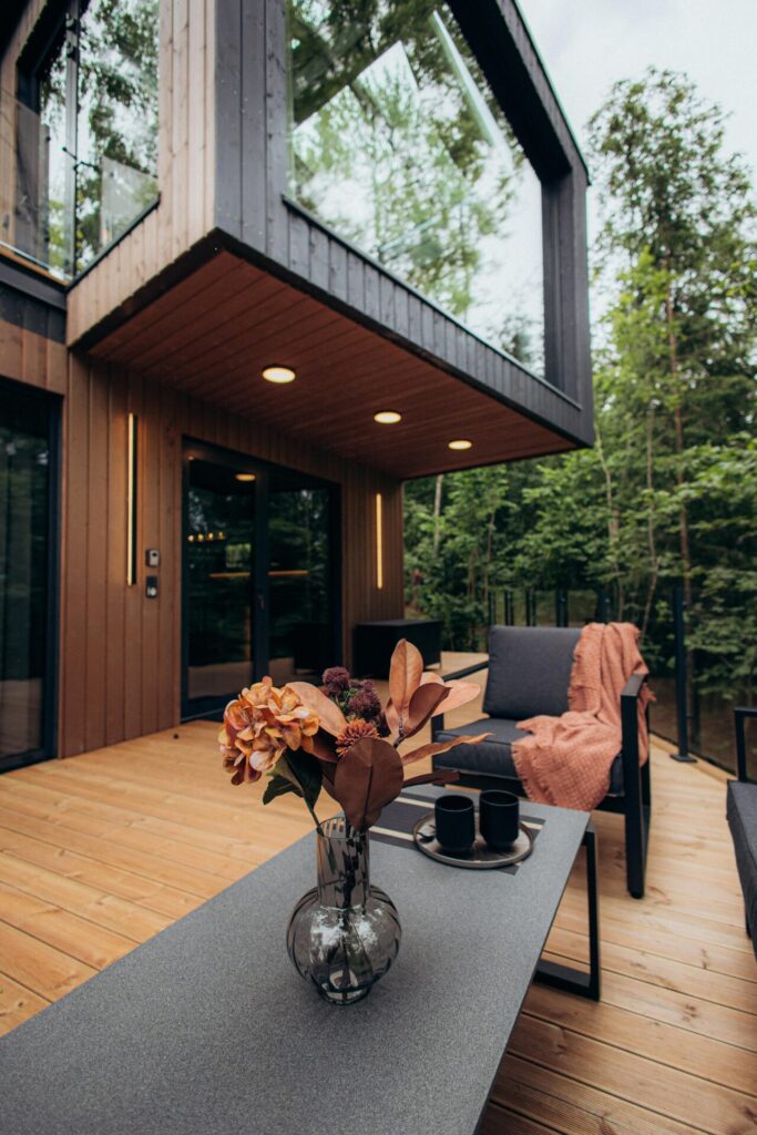 Mūsu teritorija ir rūpīgi plānota, lai nodrošinātu maksimālu privātumu un mieru. Divi skaisti, moderni namiņi atrodas vairāk kā 100 metru attālumā viens no otra – pietiekami tuvu, lai justos drošībā, bet pietiekami tālu, lai katrs viesību loks varētu pilnībā izbaudīt savu personīgo telpu. Hill Room namiņš atrodas mežmalas augstākajā punktā, savukārt Forest Room ir paslēpts dziļāk mežā, radot unikālu sajūtu par pilnīgu norobežotību no pasaules.